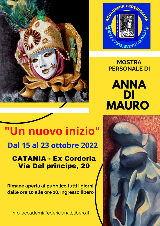 CATANIA - Dal 15 al 23 ottobre a Catania sarà possibile visitare, nell'ex Corderia di via Del principe 20, la mostra personale "Un nuovo inizio" dell'artista figurativa siciliana Anna Di Mauro. Promossa dall'Accademia Federiciana (che riprende la sua lodevole attività culturale non-profit dopo oltre 2 anni di lockdown, divieti e chiusure obbligate), la mostra - che verrà inaugurata il 15 ottobre alle ore 18:30 - propone circa 20 dipinti di medio e grande formato di grande impatto visivo, realizzate dal 2010 al 2021, raffiguranti soggetti eterogenei caratterizzati perlopiù - oltre che da vigorosa incisività - da toni cromatici vividi.