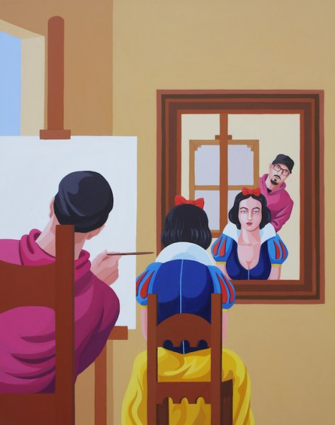 Da sempre, Veneziano pratica una pittura capace di metabolizzare le immagini già esistenti, trasformandole in nuovi intrecci iconografici e in storie inedite, raccontate attraverso una grammatica visiva che mescola la tradizione occidentale alla cultura popolare contemporanea. In questa nuova esposizione, il tema delle favole – spesso filtrate attraverso le riletture del cinema disneyano – occupa un posto privilegiato, diventando un vero e proprio teatro visivo in cui l’innocenza apparente dei protagonisti si confronta con i codici adulti della religione, del costume e della cronaca.