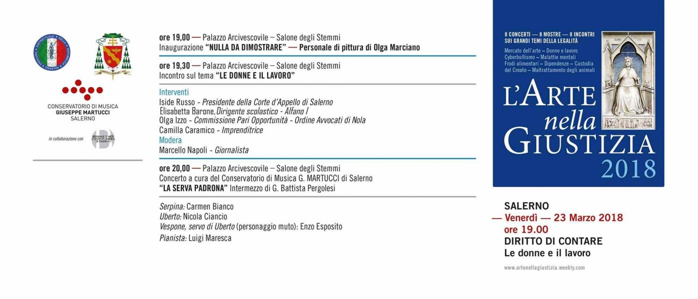 La struttura degli appuntamenti de ‘L’Arte nella Giustizia’ non verrà sconvolta, restando con la formula dello scorso anno: otto mostre, otto incontri ed otto concerti. Il 23 marzo, quindi, vi sarà l’inaugurazione e la visita della mostra d’arte, a seguire il dibattito ‘Donne e Lavoro’, moderato per questa occasione, dal giornalista Marcello Napoli, ed infine dal Concerto del Conservatorio, anch’esso assolutamente dedicato alla tematica, con l’opera buffa ‘La serva padrona’ di Giovan Battista Pergolesi Concerto preceduto dall’introduzione del M° Imma Battista, con Carmen Bianco, Nicola Ciancio, Enzo Esposito ed il pianista Luigi Maresca.