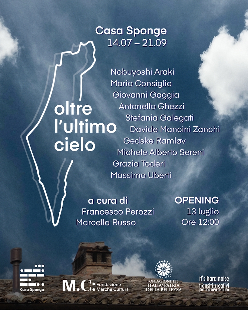 Dal 13 luglio al 21 settembre 2025 Casa Sponge ospita Oltre l’ultimo cielo, la prima tappa di un progetto articolato che si svilupperà nel tempo. Si comincia con una mostra collettiva che coinvolge 9 artisti + 1 – Nobuyoshi Araki, Mario Consiglio, Antonello Ghezzi, Stefania Galegati, Giovanni Gaggia, Davide Mancini Zanchi, Gedske Ramløv, Michele Alberto Sereni, Grazia Toderi e Massimo Uberti – chiamati a confrontarsi con il concetto di confine, oggi sempre più segnato da separazioni fisiche, culturali e simboliche.