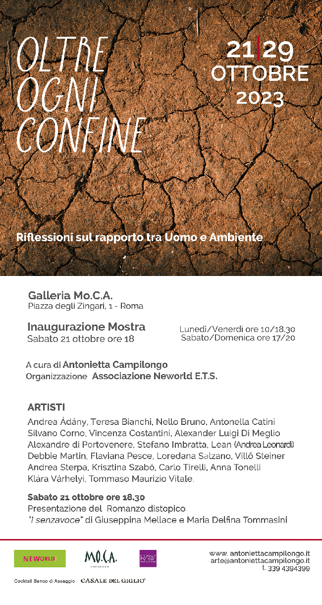 Sabato 21 ottobre alle ore 18.00 si inaugura, presso la Galleria Mo.C.A. – Piazza degli Zingari, 1 - Roma la mostra dal titolo: Oltre ogni confine/Riflessioni sul rapporto tra Uomo e Ambiente a cura di Antonietta Campilongo.
