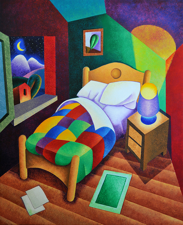 È il dialogo a caratterizzare questi ambienti che fintamente separano ciò che sta fuori da ciò che è contenuto all’interno: nell’opera “Sul confine della notte” il cono luminoso della lampada intrattiene un implicito colloquio con l’alone chiaro della luna, mentre la foglia-albero, che negli anni è diventata la tag di questo artista, è presente sia in esterni a lato della casa, sia all’interno come emblematico quadro nel quadro.