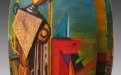 Nel quadro OMAGGIO ALLA METAFISICA, un concentrato di elementi eseguiti con tecnica a collages e colori acrilici, l’artista inserisce soggetti “presi in prestito”: da Le Muse, il volto di Guillaume Apollinaire tratto da La nostalgia del poeta, il manichino tratto da Il Trovatore, la visione del treno lontano….tutti elementi riconoscibili del linguaggio tipico delle avanguardie artistiche del 900.