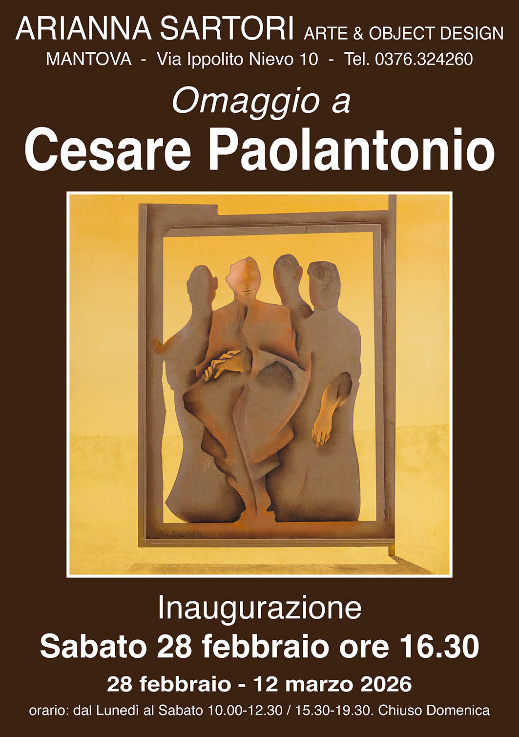 La Galleria “Arianna Sartori. Arte & Object Design” di Mantova, nella sala di via Ippolito Nievo 10, presenta una nuova interessante retrospettiva del Maestro Cesare Paolantonio (Monza 1937 - Piario 2015), sono esposte alle pareti oltre 20 opere tra oli e tecniche miste.