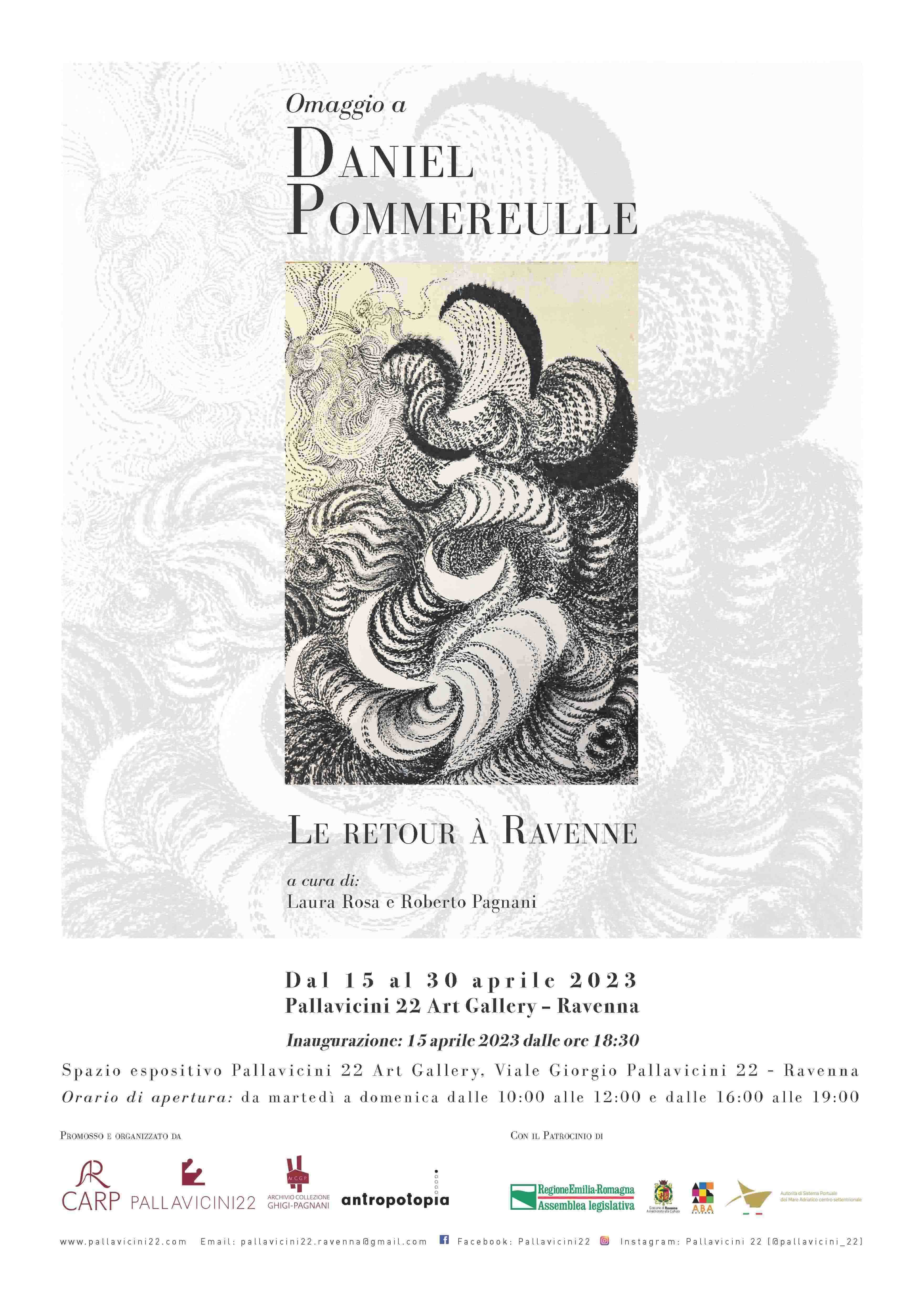 Sabato 15 aprile 2023 dalle ore 18:30 presso lo spazio espositivo Pallavicini22 Art Gallery in Viale Giorgio Pallavicini 22 a Ravenna, si inaugura “Le retour à Ravenne”, un omaggio a Daniel Pommereulle nell’anniversario della sua nascita (Sceaux 15 aprile 1937 – Parigi 30 dicembre 2003). La mostra, a cura di Roberto Pagnani e Laura Rosa con testi di Armance Léger, Luca Maggio, Roberto Pagnani, Laura Rosa, Filippo Trerè a catalogo, rimarrà allestita fino a domenica 30 aprile e sarà aperta al pubblico dal martedì alla domenica dalle 10 alle 12 e dalle 16 alle 19.