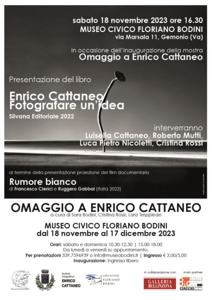 Sabato 18 novembre 2023 alle 16.30 sarà presentato il volume monografico di Giorgio Zanchetti e Luca Pietro Nicoletti Enrico Cattaneo. Fotografare un’idea (Silvana Editoriale 2023) presso il Museo Civico Floriano Bodini di Gemonio. Intervengono Luisella Cattaneo, Roberto Mutti, Luca Pietro Nicoletti, Cristina Rossi. Al termine dell’incontro verrà proiettato il film documentario dedicato al fotografo, Rumore bianco di Francesco Clerici e Ruggero Gabbai (Italia, 2022).