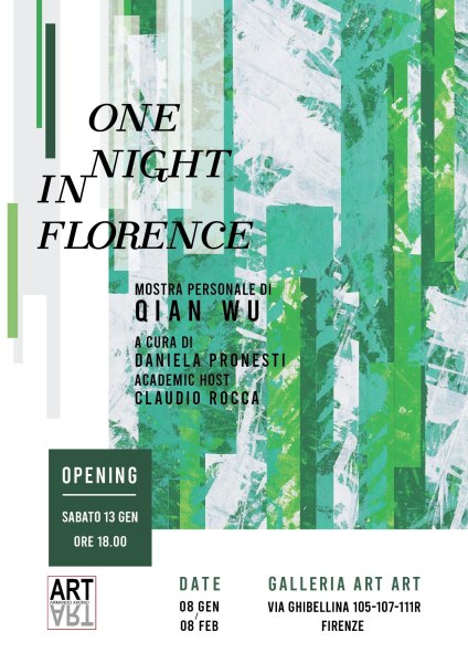Verrà inaugurata alla Galleria Art Art di Firenze sabato 13 gennaio 2024 One night in Florence, mostra personale di Qian Wu, a cura di Daniela Pronestì. Qian Wu ha vinto il Fiorino d’oro (pittura) del XL Premio Firenze che gli è stato assegnato a dicembre 2023 a Palazzo Vecchio.