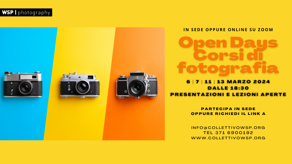 Dal 6 al 13 marzo si terranno i nostri Open Days per farvi conoscere la nostra scuola di fotografia e i nostri corsi di fotografia in partenza da metà marzo 2024.