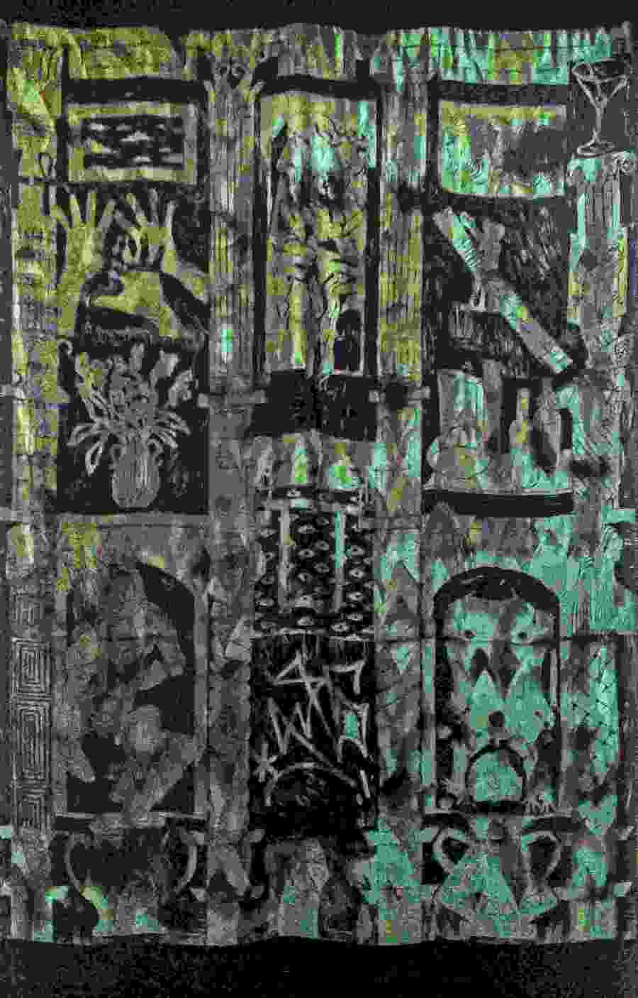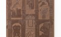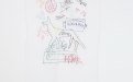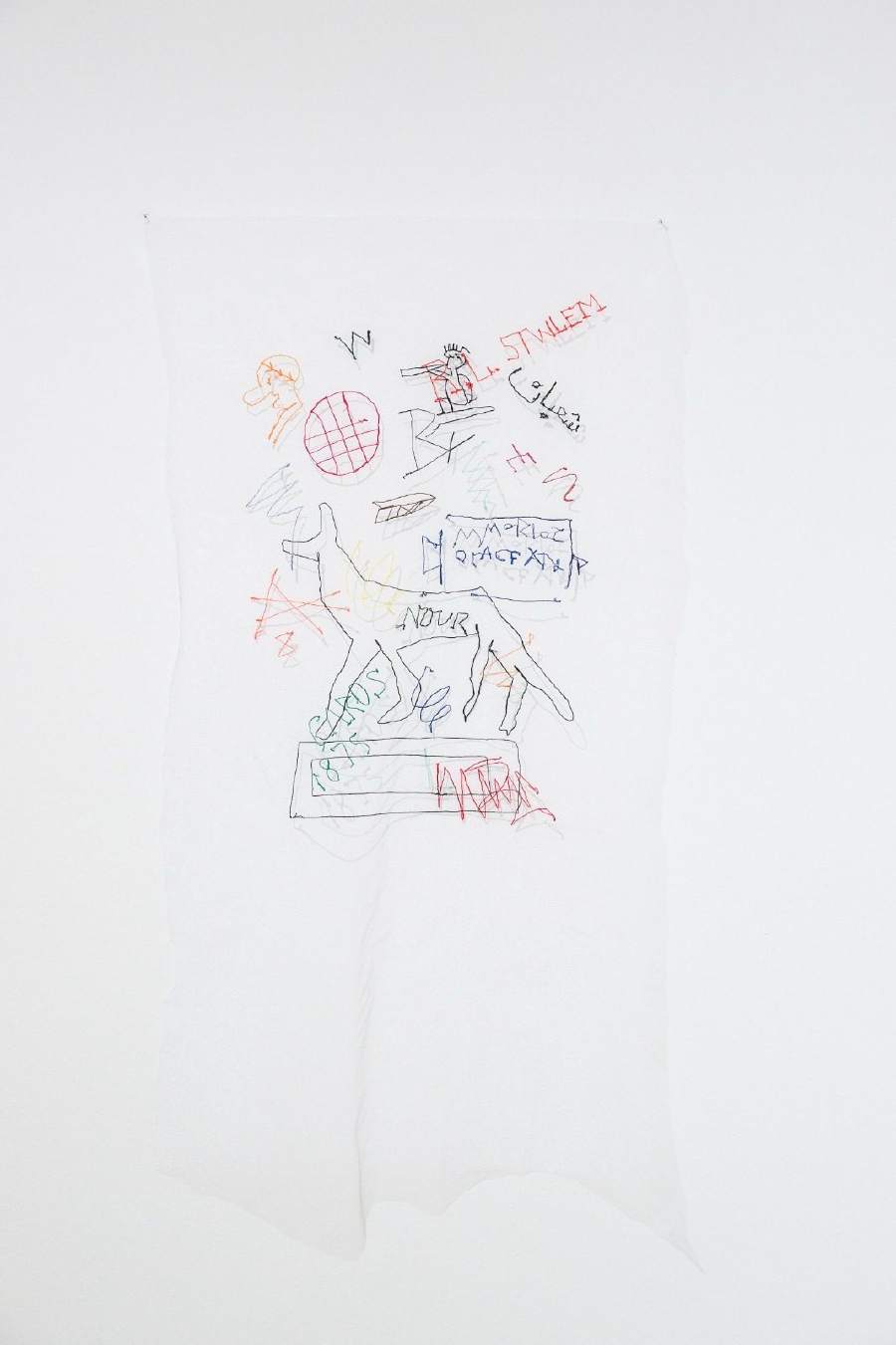 Nelle opere su velo compaiono, mescolate con fili colorati, immagini provenienti da antichi graffiti e da quegli scarabocchi tipici dei block-notes, utilizzati nei negozi per provare le penne nuove. Il ricamo decontestualizza la semplicità e la spontaneità dei messaggi originali collocandoli sulla superficie morbida del tulle. I segni a cui si ispirano, “incisi” su pietra o su carta, si trasformano in forme tridimensionali che fluttuano sulle pareti dello spazio espositivo. Si realizza visivamente un processo di “strappo” di uno strato di architettura e di tempo, i quali vengono introdotti nel nostro presente, in tempo reale, e consegnati a quell’eternità a cui fin dal principio sembrano tendere. Le due grandi opere, situate al secondo piano della galleria, e realizzate durante il soggiorno della coppia all’American Academy di Roma nel 2019, raccontano il contesto della città e la sua stratificazione casuale: dagli antichi elementi architettonici visti durante le passeggiate, ai busti con la pettinatura “a coda di topo” degli anni Novanta, ispirata alla copia romana di Dioniso a Palazzo Massimo, agli occhi malvagi che si ritrovano su una tote bag della catena danese Flying Tiger. I due artisti creano una matrice di immagini in collisione, dove abbondano elementi formali e temporali, che vengono trasposti su due differenti superfici, il linoleum e il velluto, tramite l’incisione e la goffratura.