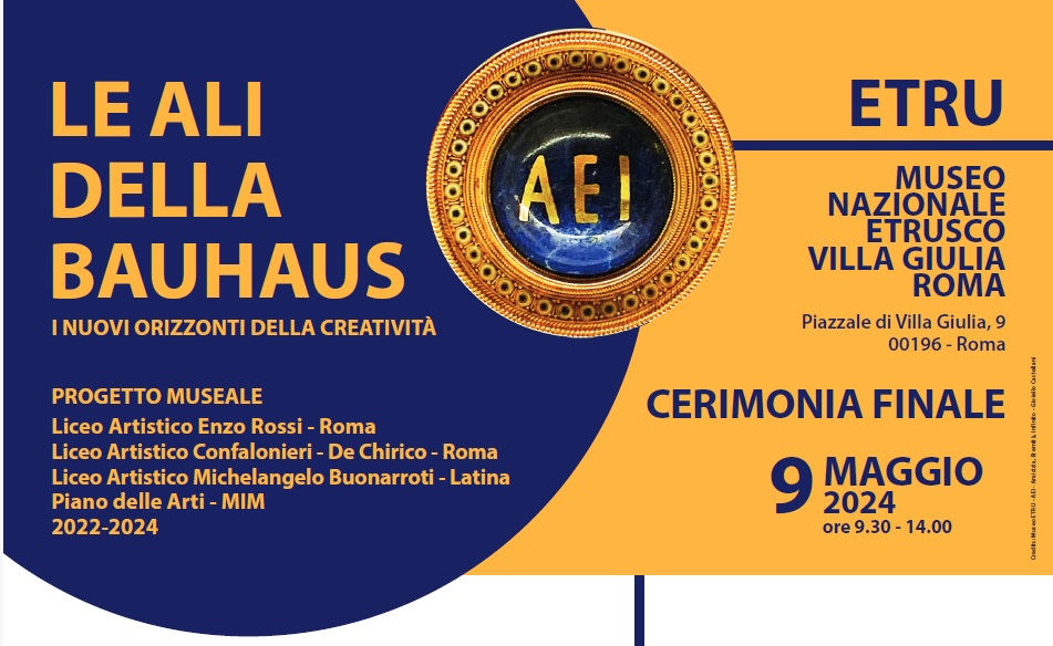 Il progetto, finanziato dal Ministero dell’Istruzione e del Merito (D. D. n. 2003 del 23 agosto 2022, misura d) - Allegato A al D.P.C.M. 12 maggio 2021 – “Piano Triennale delle arti”), si concluderà il prossimo 9 maggio, “Giornata dell’Europa”: la cerimonia finale dal titolo “Le Ali della Bauhaus. I nuovi orizzonti della creatività” si terrà presso il Museo Nazionale Etrusco di Villa Giulia “ETRU”; la progettualità degli allestimenti museali continuerà presso i singoli istituti fino alla fine dell’anno scolastico.