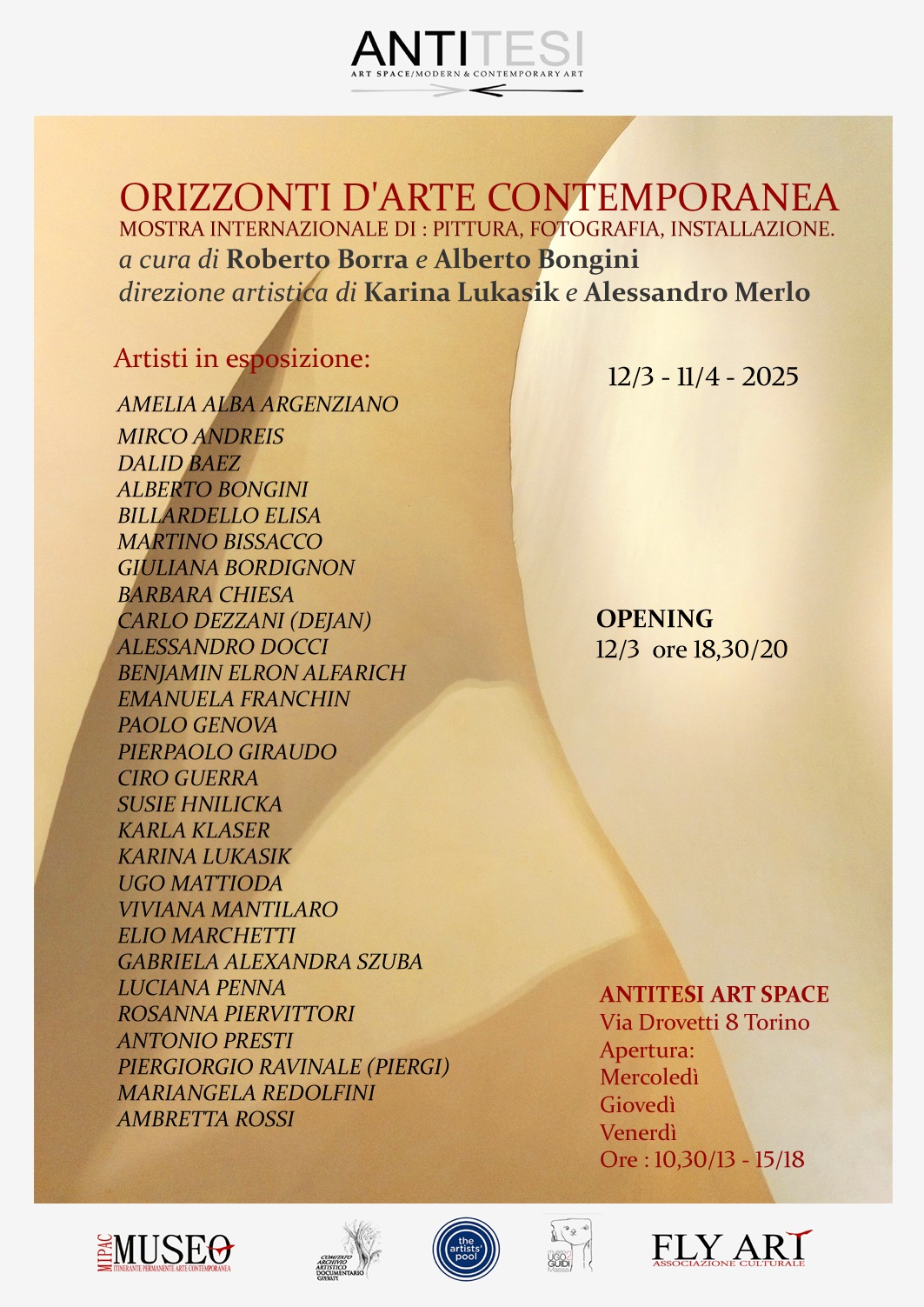 La mostra “Orizzonti d'arte contemporanea” ha come obiettivo primario la stimolazione di un dialogo e di un confronto tra gli artisti dell’Associazione Culturale Fly Art presenti a più livelli in contesti artistici nazionali ed internazionali . L’evento a cura di Roberto Borra critico e curatore dell’Associazione Fly Art e da Alberto Bongini, presidente dell’Associazione con la direzione artistica di Karina Lukasik e Alessandro Merlo offre al pubblico torinese l’opportunità di immergersi in frammenti del “sentire contemporaneo” più autentico, che và al di là dei singoli valori artistici o economici espressi da ciascuno. L’esposizione di pittura, fotografia e installazione che si inaugura il 12 marzo con la partecipazione di artisti provenienti da varie regioni d'Italia e da: Svizzera, Croazia, Polonia e Messico si rivela attenta ai differenti aspetti dell’arte attuale spaziando da espressioni di gusto figurativo, ad interpretazioni astratte ed informali, da rappresentazioni di sapore surrealista a visioni di ispirazione impressionista, da opere che si ispirano alla tradizione dell'arte classica a lavori che manifestano una ricerca di innovazione, privilegiando sempre l'aspetto intimista e personale della realtà (visibile ed invisibile) lontana dalla semplice rappresentazione o riproduzione di canoni estetici consolidati. Opere antitetiche che si affollano in un complesso intreccio di trame esistenziali legate nella contemplazione di una comune profondità espressiva dalla quale emergono memorie, sogni e pensieri del vissuto delle singole identità degli artisti che nel prezioso scrigno della Galleria Antitesi Art Space situata nel quartiere Liberty di Torino, si esprimono in un suggestivo affresco corale.