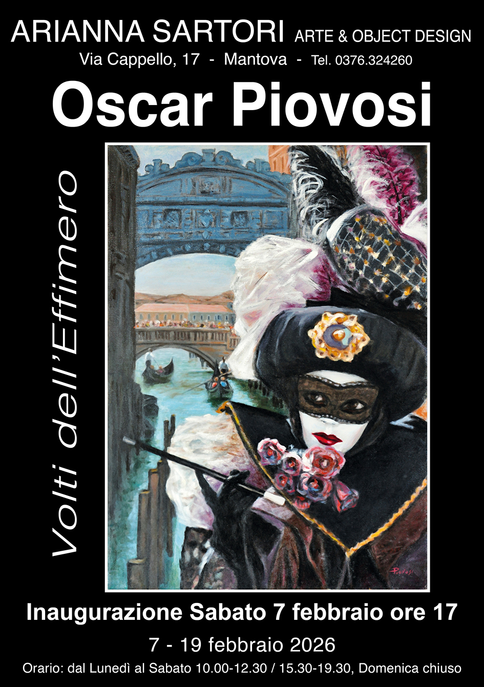 La Galleria Arianna Sartori di Mantova, nella sala di via Cappello 17, presenta una nuova mostra dell’Artista Oscar Piovosi intitolata “Volti dell’Effimero”.