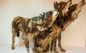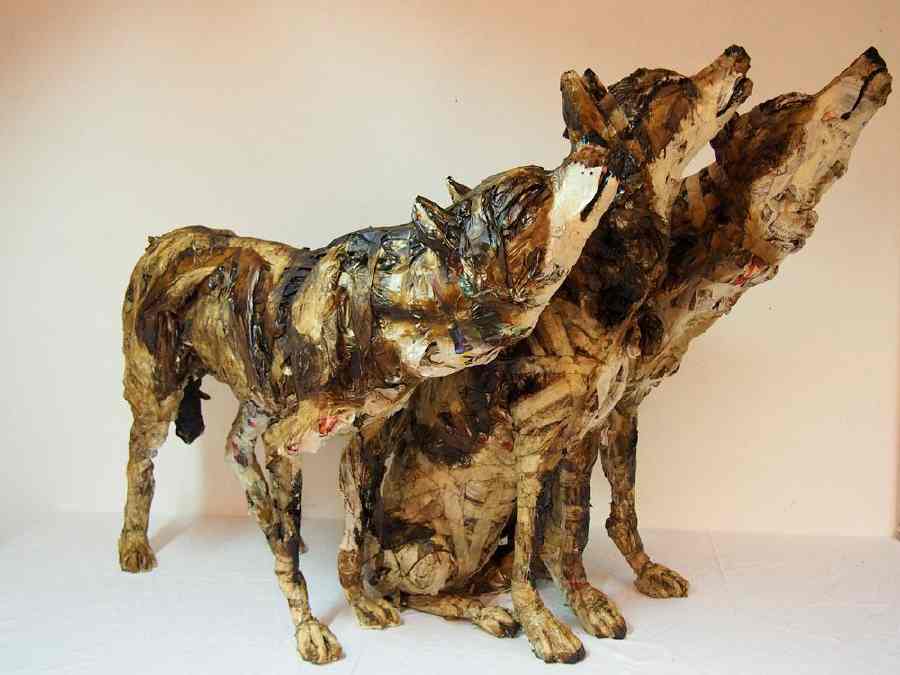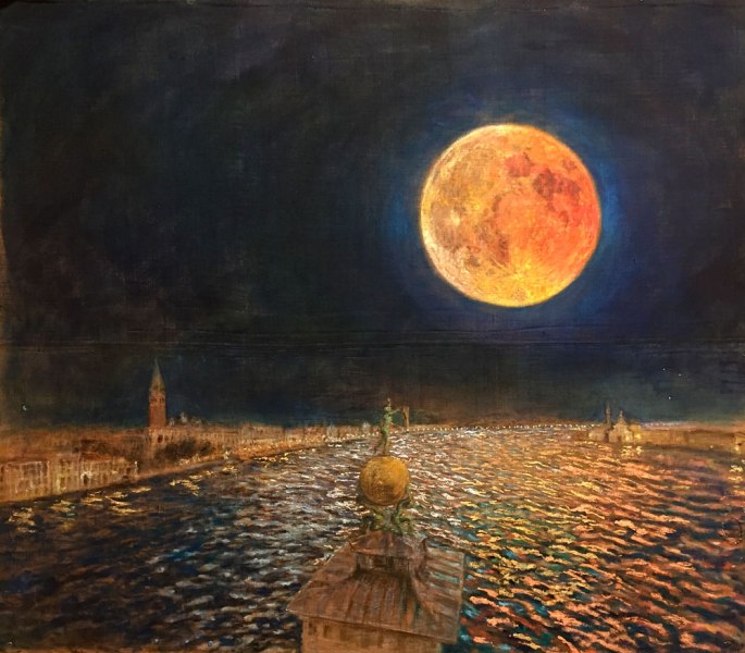 Di acqua, ma stavolta è laguna, dice la storia artistica di Luana Segato. I suoi potenti arazzi contemporanei si muovono su un tappeto d’erba o si sviluppano su pavimenti antichi occupandoli come un gigantesco animale marino. Contengono tutti i colori delle isole e si sviluppano per metri e metri suggerendo un canale vivo e vitale che racconta la storia della città. Protagonista è sempre lui, il Canal Grande, anche quando Segato lo ferma dentro una tela cucendo fra loro le due rive. Così intelaiata, Venezia resisterà altri millenni. Il segreto della tela consumata dai secoli, è invece la base da cui parte il pennello di Elisabetta Zanutto. Lo splendore della città dei dogi ritorna trionfale nei dipinti di questa artista cresciuta tra Santa Maria Formosa e la Giudecca. Cacciatrice di vecchi teleri, li recupera conservandone cuciture, strappi, bruciature e li trasforma nel palcoscenico su cui manda in scena una Venezia imbibita di luce, pronta a liquefarsi nei tramonti infuocati o a confondersi con il cielo dell’imbrunire. Mentre gli uomini, i vaporini, i traghetti, le gondole sono del tutto assenti. Resta solo una pace rarefatta. L’investigazione della calma e dell’armonia è il dato fondante delle opere di Marialuisa Tadei. Le sue sculture aeree, benché declinate in materiali pesanti come marmo, alabastro, onice, sodalite, dirigono lo sguardo dell’osservatore verso l’alto. Tra materia e spirito si instaura un dialogo profondo. Del resto l’uomo è l’unico animale in grado di sollevare gli occhi al cielo. L’artista riminese, che da alcuni anni ha aperto il suo atelier vicino ai Giardini della Biennale, ha sviluppato una poetica in cui la tensione verso la bellezza indica l’aspirazione alla grazia divina. Il progetto dello scultore e performer Alberto Salvetti riguarda ancora la razza umana, ma esaminata nella sua catastrofica deriva. La distruzione progressiva della Natura e la sua invocazione d’aiuto indirizzata proprio a chi l’ha compromessa, è diventata per l’artista vicentino contenuto e sostanza del proprio lavoro. In favore della salvaguardia di animali selvatici come lupi e gabbiani ridotti a prede, a causa della devastazione dei territori e dell’inquinamento, la mostra esibisce due lupi in carta, ferro bitume giudaico nella posa di ululare alla Luna e alcuni gabbiani sopravvissuti a macchie di petrolio che invadono il loro mare.