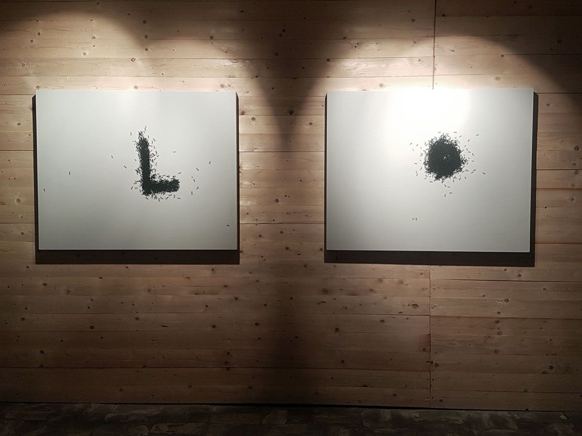 Sono due grandi tele, dove un corteo di formiche assume le forma delle iniziali di Osvaldo Licini: si tratta di una delle tante possibili varianti che nel tempo ha assunto la cancellatura, modalità espressiva inaugurata da Isgrò nel 1964 nell’alveo della sperimentazione verbo-visuale.