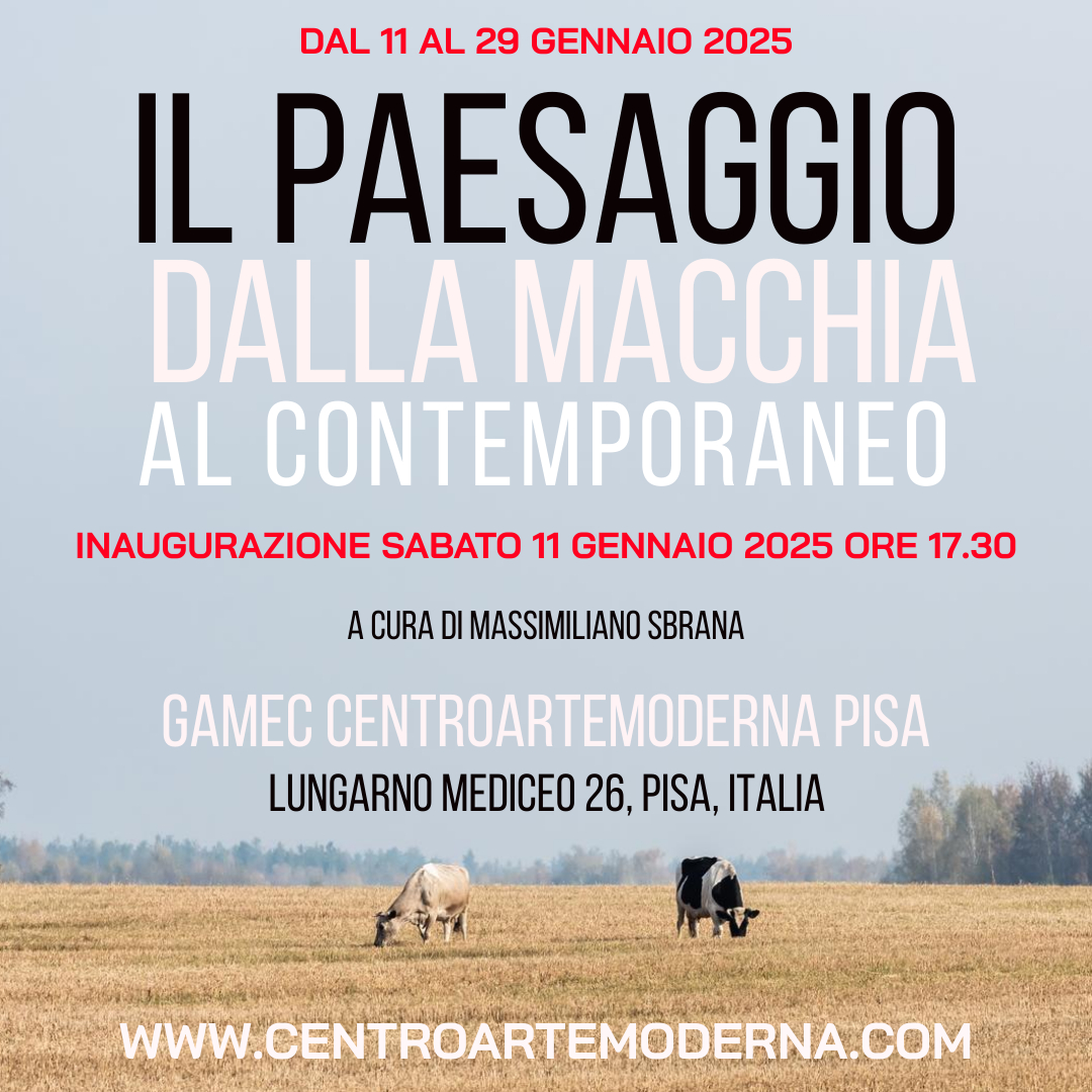Si inaugurerà Sabato 11 Gennaio 2025 alle ore 17,30 (visitabile fino al 29 Gennaio 2025 con ingresso libero) ordinata e curata da Massimiliano Sbrana, presso il GAMeC CentroArteModerna di Pisa (Lungarno Mediceo,26) la mostra "Dalla Macchia al Contemporaneo" dedicata al tema del "Il Paesaggio" .