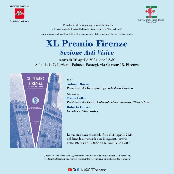 Il prossimo 16 aprile alle ore 12.30 avrà luogo a Palazzo Bastogi di Firenze la cerimonia di apertura della mostra del XL Premio Firenze.