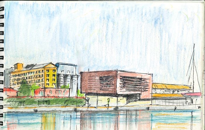 Le “mezze ore” sue, volte a delineare gli edifici che ne costituiscono il paesaggio antropico-naturale, come il palazzo condominiale a mosaico di Cino Zucchi, o quello dell’Autorità Portuale, o i pub e i locali che nel tempo hanno aperto riconvertendo vecchi magazzini dismessi, o altri colmi di fascinazione proprio perché in stato di abbandono, come il cosiddetto Sigarone insieme a ulteriori lacerti industriali, o gli oggetti mobili come la nave Lady Aziza e il Moro di Venezia, gli hanno suggerito, partendo da disegni di circa 15x20 cm, gli ingrandimenti su plexiglas (circa 50x80 cm) di questa esposizione, con stampe ora più lucide per restituire la liquidità marina e cromatica degli originali, ora più opache per i bianchi e neri delle piattaforme e dei pozzi di estrazione di idrocarburi.