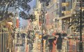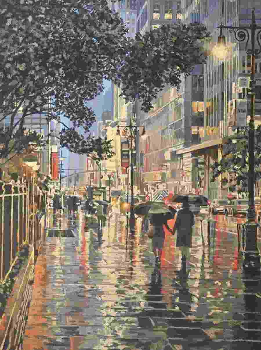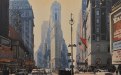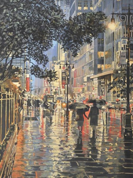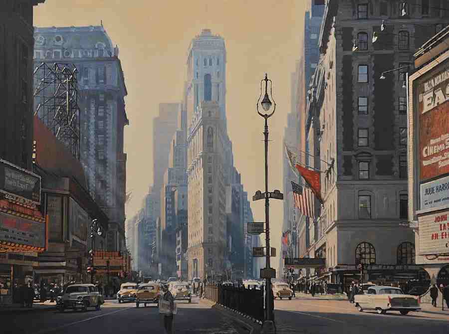 E’ la “sua” atmosfera americana: foto-realistica. Benché meno dettagliata rispetto alle precedenti produzioni. Una assunzione di matericità che rappresenta la sintesi del suo lungo percorso emotivo. La luce e le ombre, i riflessi. La pioggia e un pathos rarefatto, quasi antitetico, al monumentalismo dei grattacieli. Gli uomini camminano senza volto accanto alle automobili: prodigi di un design che interpretava il benessere americano.