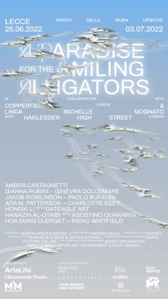 Lecce - dal 26 giugno al 3 luglio, nell’ambito di Capriola | an art week in Lecce, BeAdvisors Art Department e Knot Agency presentano a paradise for the smiling alligators, seconda edizione del format espositivo paradise, presso il bastione ovest del Parco delle Mura Urbiche di Lecce. La mostra è organizzata in collaborazione con le gallerie Copperfield (Londra) e Linda Michelle Mognato per la galleria Harlesden Highstreet (Londra) e vede la partecipazione de* artist* Ada M. Patterson, Ambra Castagnetti, Charlotte Edey, Gianna Rubini, Ginevra Dolcemare, Hawazin Al-Otaibi con Agostino Quaranta, Hoa Dung Clerget, Hongxi Li con DATEAGLE ART, Jakob Rowlinson, Paolo Bufalini e Rieko Whitfield.