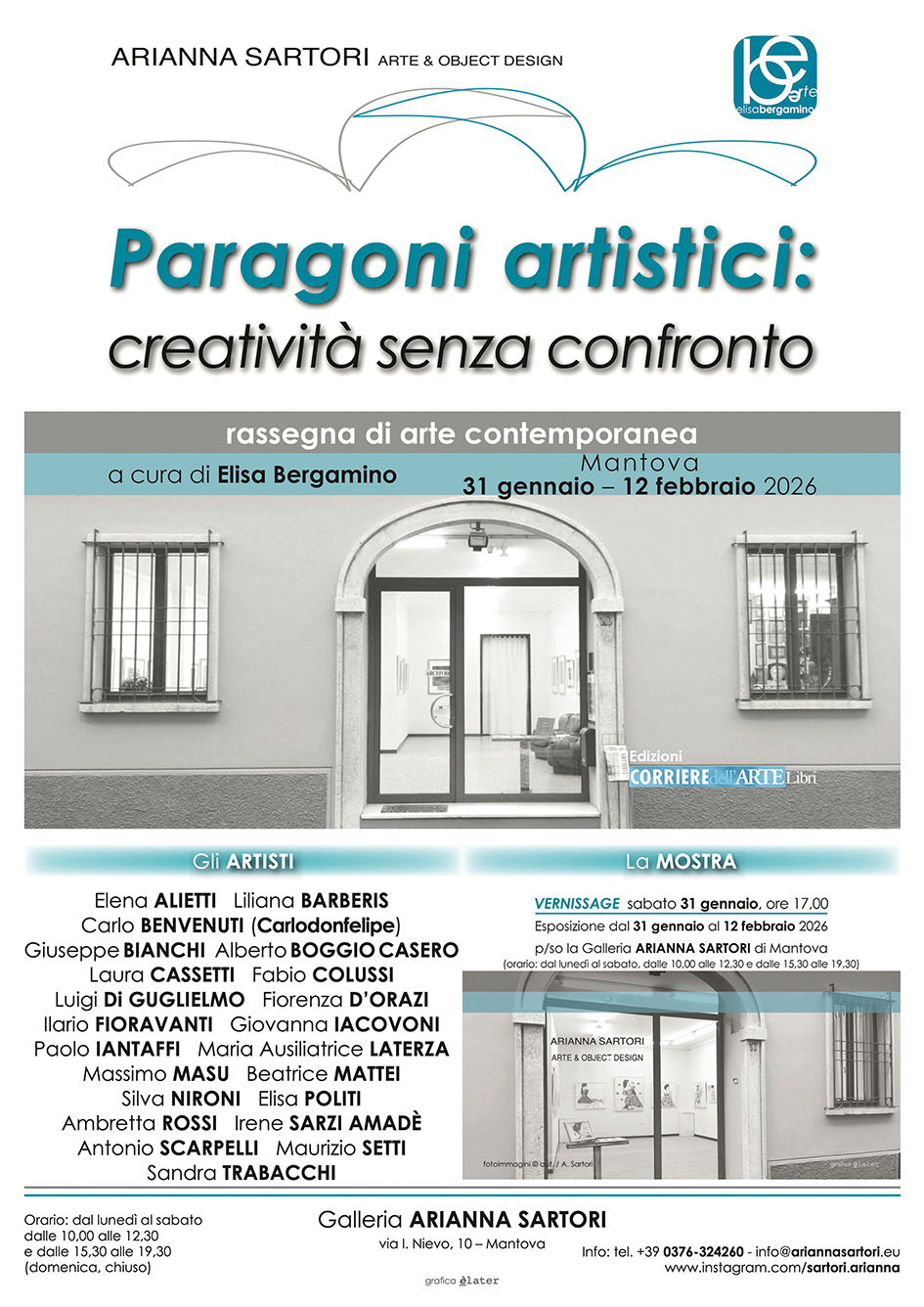 La Galleria Arianna Sartori di Mantova, nella sala di via Ippolito Nievo 10, il prossimo Sabato 31 gennaio alle ore 17.00, inaugura la rassegna d'arte contemporanea, a cura di Elisa Bergamino: “Paragoni artistici: creatività senza confronto”, opere di Elena Alietti, Liliana Barberis, Carlo Benvenuti (Carlodonfelipe), Giuseppe Bianchi, Alberto Boggio Casero, Laura Cassetti, Fabio Colussi, Luigi Di Guglielmo, Fiorenza D’Orazi, Ilario Fioravanti, Giovanna Iacovoni, Paolo Iantaffi, Maria Ausiliatrice Laterza, Massimo Masu, Beatrice Mattei, Silva Nironi, Elisa Politi, Ambretta Rossi, Irene Sarzi Amadè, Antonio Scarpelli, Maurizio Setti, Sandra Trabacchi.