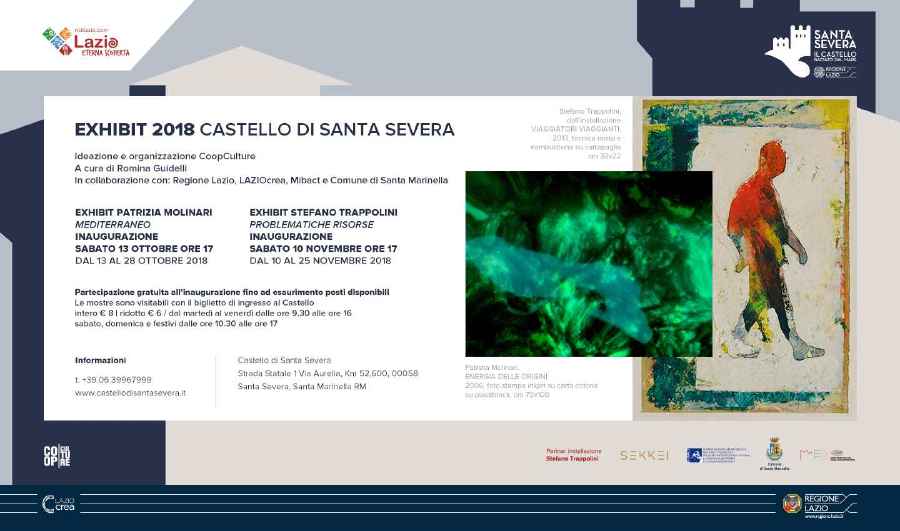 I due artisti, protagonisti degli eventi Art One Shot estivi, nelle tappe Exhibit autunnali presenteranno il rispettivo lavoro dedicato al comune tema del viaggio: ai migranti, ai viaggiatori, al Mare Nostrum. Le diverse poetiche e i concepts delle mostre sono stati simbolicamente riassunti nelle pochissime opere esposte e raccontate dagli stessi artisti durante gli eventi Art One Shot avvenuti al Castello nei mesi di giugno e luglio, preview immaginate come occasioni di conoscenza ‘ravvicinata’ tra artista e pubblico, che oggi culminano nelle mostre personali denominate Exhibit: mediterraneo di Patrizia Molinari e problematiche risorse di Stefano Trappolini.