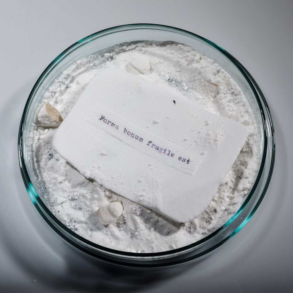 Mutazione consentono alla pietra di assecondare le ipotesi del altre suggestioni narrative. Il marmo muta il suo statuto e incontra la fisicità di altre sostanze e materie nelle quali finisce per mimetizzarsi.