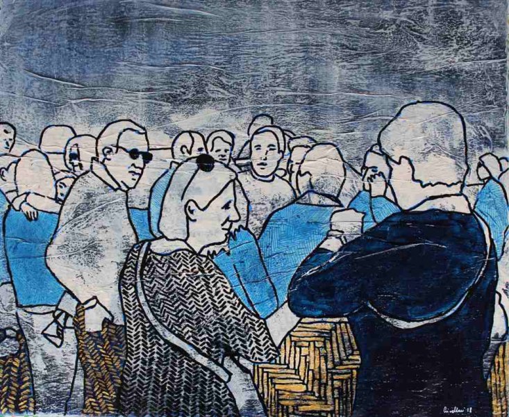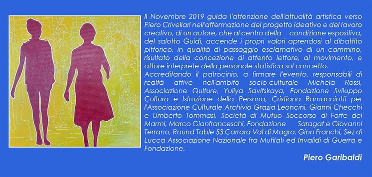 Nelle “personalità” di Crivellari, classe 1951, l'espressività figurativa è dettata da un dialogo con la tela, afferma Piero Garibaldi curatore dell'iniziativa, capace di decidere con il segno del pennarello, mosso in uno spazio movimentato tra giornale, colla, carta ed acrilico, l'identità alla condotta della