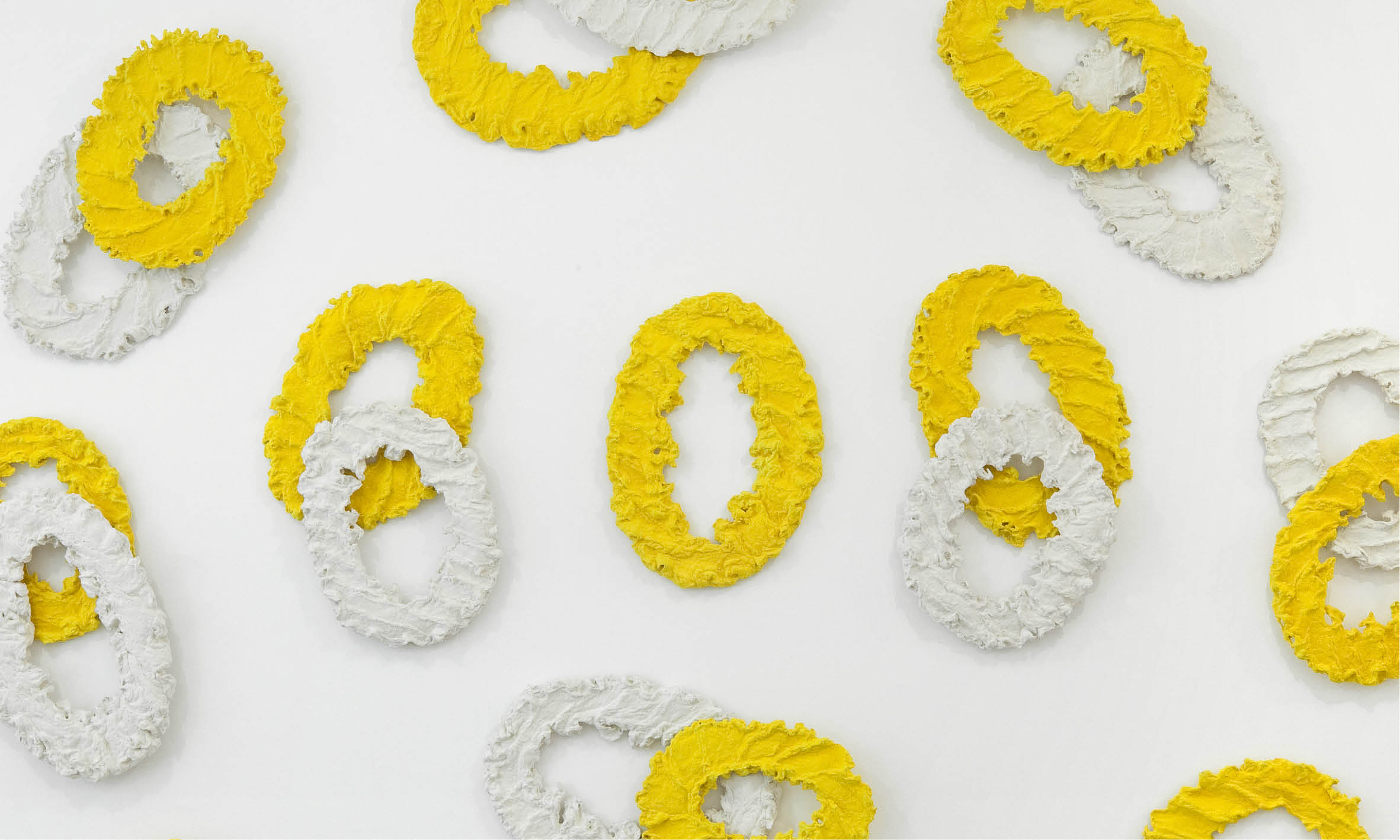 A partire dagli inizi degli anni Settanta Pino Pinelli ridefinisce il concetto di spazio pittorico, portando il colore delle sue tele monocrome a fuoriuscire dai limiti del quadro. Questo strabordare raggiunge esiti estremi alla metà del decennio quando le sue opere, create con materiale dipinto in cui l’accordo tra i colori si fa corpo e presenza fisica e reale, diventano figure autonome immerse nello spazio. Il suo lavoro è sempre stato concepito come corpo pittorico, come un organismo che occupa lo spazio grazie all’azione del gesto che ne costruisce le traiettorie, le concentrazioni e le dilatazioni, che contribuiscono alla creazione di una visione unitaria. Come afferma lo stesso Pinelli nell’intervista con Tommaso Trini “in ogni mia opera è come se io avessi frammentato il monocromo e lo avessi disseminato nello spazio. Le ‘frammentità’ sono entità che si dispongono sempre autonomamente nello spazio secondo questo gesto del lancio. In questo modo ho voluto rinnovare non la pittura come genere, bensì la mia grammatica personale del ‘fare pittura’”. La materia esalta la tattilità del valore cromatico, che dà presenza alle forme e porta ad un coinvolgimento dello spettatore nel qui ed ora dell’esperienza visiva.