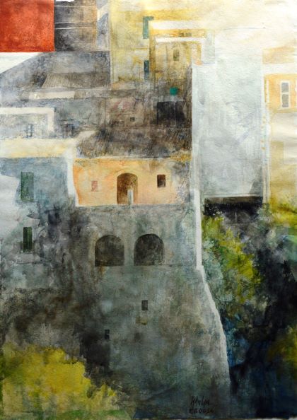 I suoi pennelli indagano la superficie della carta con familiarità, con moto apparentemente casuale, alla ricerca dei punti e dei piani dove la luce incrocia l’essenza più intima, evidenziando la complessità dei volumi, rilevando persino le stratificazioni che il tempo implacabile ha imposto alle architetture e alla vita stessa scorsa di quei luoghi.