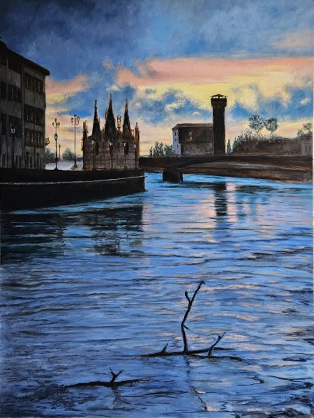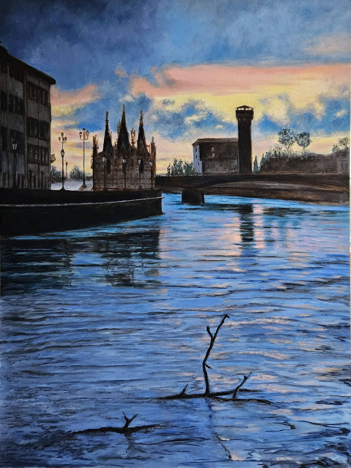 La mostra “Pisana Aetas” raccoglie opere che raccontano Pisa attraverso lo sguardo di chi l’ha vissuta intensamente: come studente, come padre, come artista. I paesaggi urbani, le architetture storiche, le atmosfere familiari e i ritratti affettuosi compongono un diario visivo che restituisce bellezza, memoria e verità.