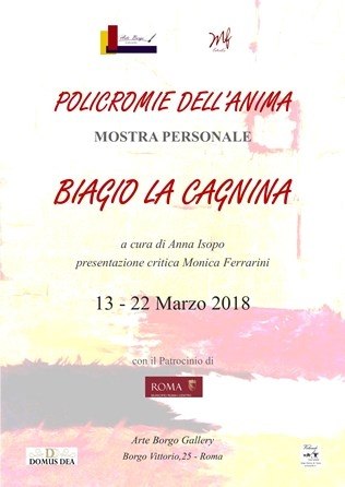 L’artista romano Biagio La Cagnina presenta al pubblico una selezione delle sue opere più significative nella mostra personale “POLICROMIE DELL’ANIMA” nello spazio espositivo di Arte Borgo Gallery in Borgo Vittorio 25 Roma