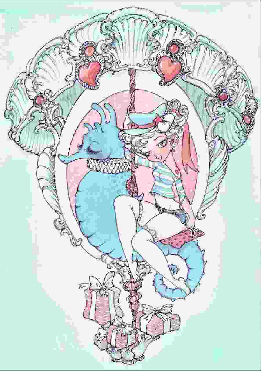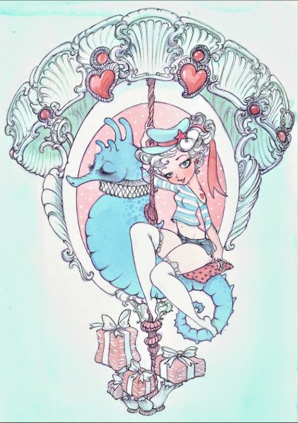 Provenendo dalla propria fascinazione infantile per le volteggianti ninfette del film disneyano Fantasia, mille leggiadre femminucce hanno cominciato a sgorgare dai suoi inchiostri leggeri. E qui si gioca davvero l’atmosfera tipica di tale universo creativo,nel dispiegarsi di una fantasmagoria di bambole preferibilmente un poco discinte lontanissime dal vero e forse proprio per questo motivo specialmente ammalianti. È un mondo fittizio morbidamente Liberty, immerso in una malizia acquerellata, rosea, che appare sempre comunque confidente e delicata.