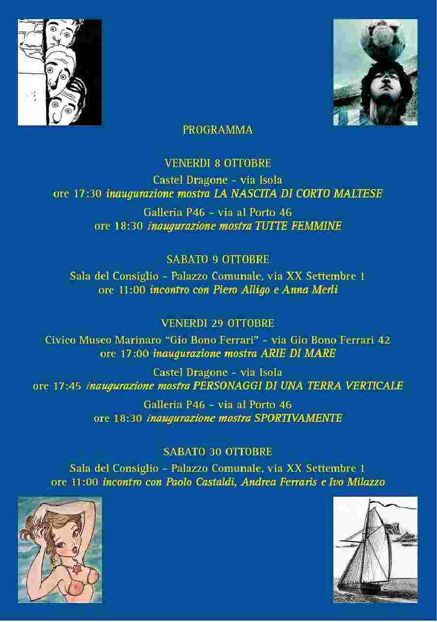 Il finesettimana successivo, VENERDI 29 OTTOBRE alle ore 17.00 inaugurerà presso il Civico Museo Marinaro “Gio Bono Ferrari”, via Gio Bono Ferrari 42, la mostra ARIE DI MARE di Andrea Ferraris; a seguire, alle ore 17.45 all'interno di Castel Dragone, via Isola, inaugurerà la mostra PERSONAGGI DI UNA TERRA VERTICALE di Ivo Milazzo; infine alle ore 18.30 presso la Galleria P46 di via al Porto inaugurerà la mostra SPORTIVAMENTE di Paolo Castaldi.