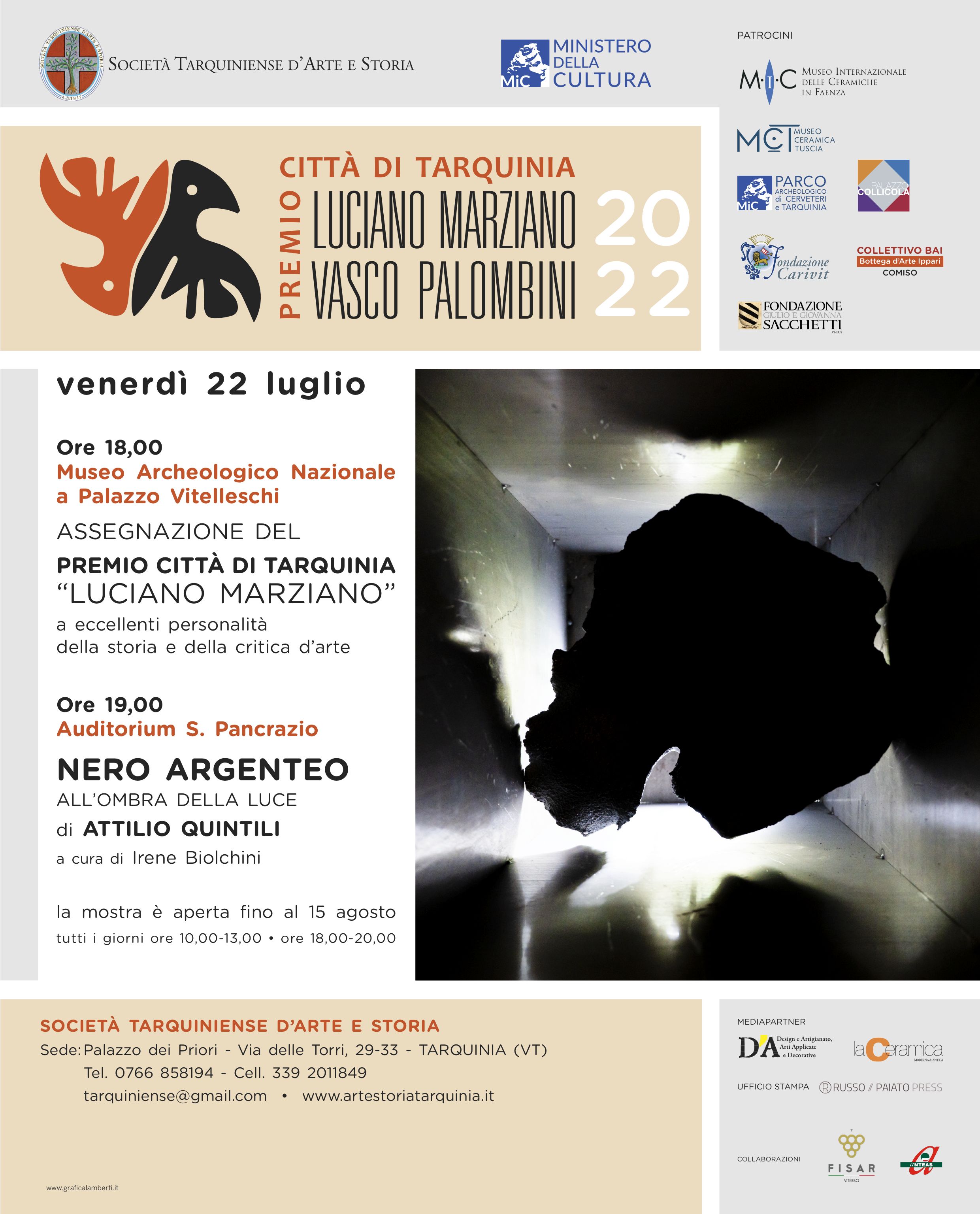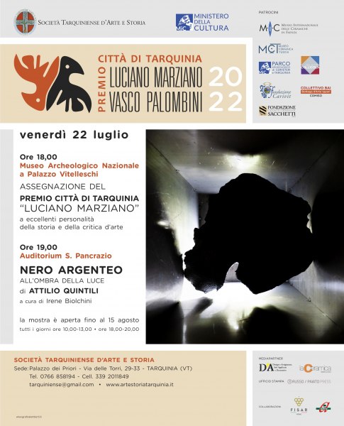 S.T.A.S. - Tarquinia (VT), Società Tarquiniense d’Arte e Storia, venerdì 22 luglio 2022 alle ore 18.00 presso Palazzo Vitelleschi, sede del Museo Archeologico Nazionale di Tarquinia, assegnerà il Premio Città di Tarquinia “Luciano Marziano”giunto alla sua seconda edizione. Seguirà alle ore 19.00, pressoAuditorium S. Pancrazio, il vernissage della mostra di Attilio Quintili, “Nero argenteo. All’ombra della luce” a cura di Irene Biolchini.