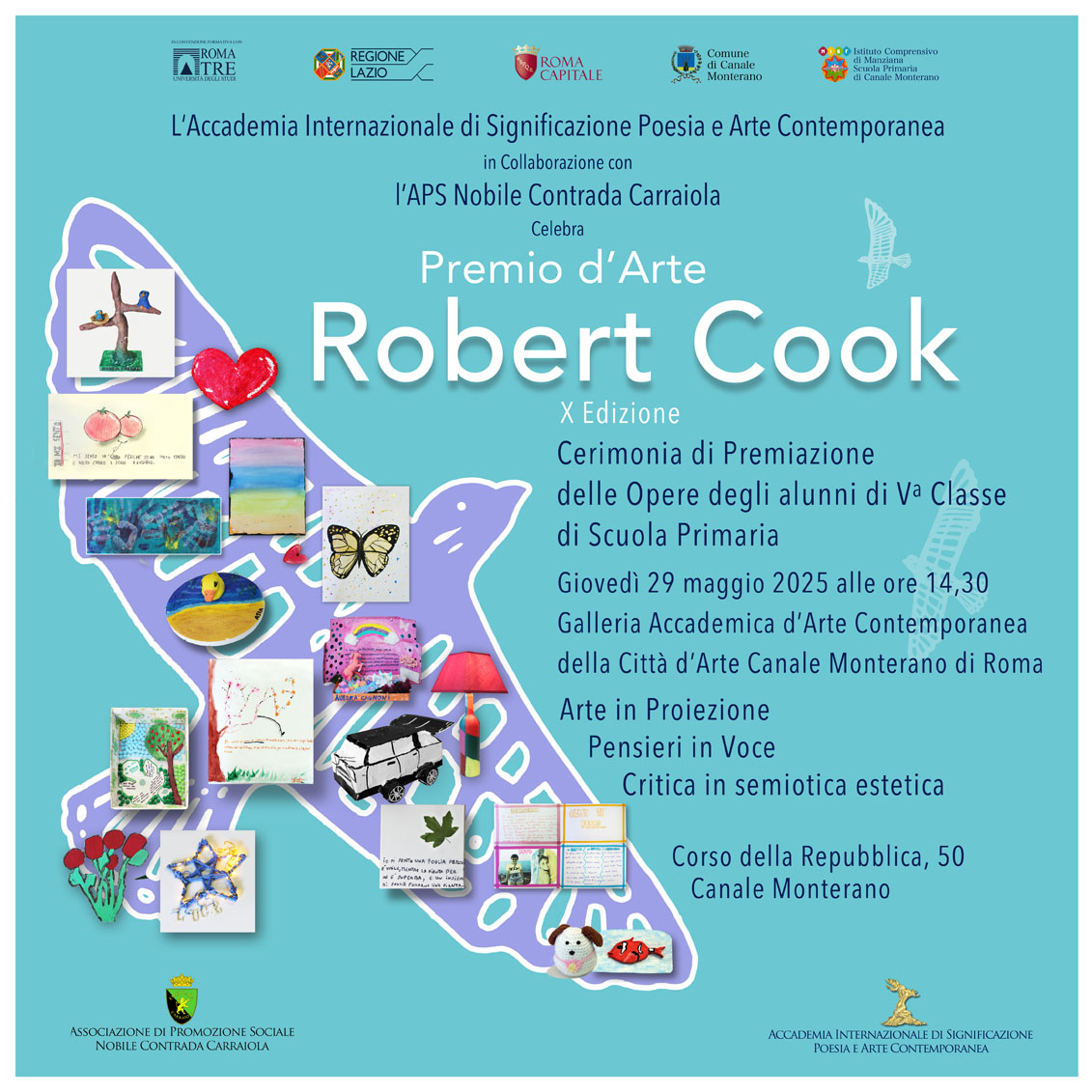L’Accademia Internazionale di Significazione Poesia e Arte Contemporanea, in convenzione formativa con l’Università degli Studi di Roma Tre, accredito della Regione Lazio, iscritta all’albo di Roma Capitale e del Comune di Canale Monterano, con il patrocinio dell’Istituto Comprensivo di Manziana per la Scuola Primaria di Canale Monterano, in collaborazione con l’APS Nobile Contrada Carraiola, celebra la decima edizione del Premio d’Arte Robert Cook.