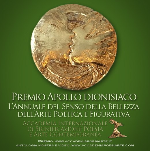 Fra Arte in mostra, Poesia in voce, diplomi, critica in semiotica estetica delle opere, pubblicazione nella Mostra Accademica dell’Arte Contemporanea online e nell’Antologia della Poesia Contemporanea online e trofei in medaglia “Apollo dionisiaco” in pregiata fusione artigianale del Laboratorio orafo di Via Margutta 51 in Roma, effigie del bacio di sintesi di dionisiaco e di apollineo, d’inconscio e di coscienza nel senso, il premio si terrà il 16 Novembre 2019, presso il Salone del duecentesco Castello della Castelluccia in Roma.