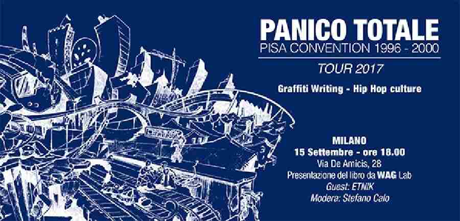 Venerdì 15 settembre presso WAG Lab di Milano si terrà la presentazione di “Panico Totale. Pisa Convention 1996-2000”, il libro che per la prima volta in Italia documenta su carta la nascita e lo sviluppo di una manifestazione Hip Hop italiana. Dopo Bologna, Firenze, Torino e Dresda, Panico Totale arriva a Milano. Dalle ore 18 presso lo storico negozio milanese, punto di riferimento della scena hip hop e graffiti writing, si riuniranno la storica dell’arte e autrice del libro, Alessandra Ioalé, insieme a Etnik, uno dei protagonisti di Panico Totale oggi artista affermato a livello internazionale nel campo dell’Urban Art e del Muralismo urbano, moderati da Vandalo, tra i massimi esperti della disciplina writing, per raccontarci ciò che sono state e che significato hanno avuto le cinque edizioni di Panico Totale, la storica manifestazione che riunì a Pisa tutta la cultura di strada italiana e non solo con la partecipazione di personalità importanti come PhaseII da New York e i maestri tedeschi Loomit, Daim, Toast, CanTwo, e le più influenti crew italiane tra cui PDB, SPA, EAD, KNM, CKC, THP, MNP, 23Recordz. Si parlerà della nascita del progetto editoriale, il suo sviluppo e la sua concretizzazione in un volume autoprodotto in questa prima edizione limitata con la riproduzione nel retro di sovraccoperta dell’illustrazione originale che Etnik realizzò per il manifesto dell’edizione del 1998.