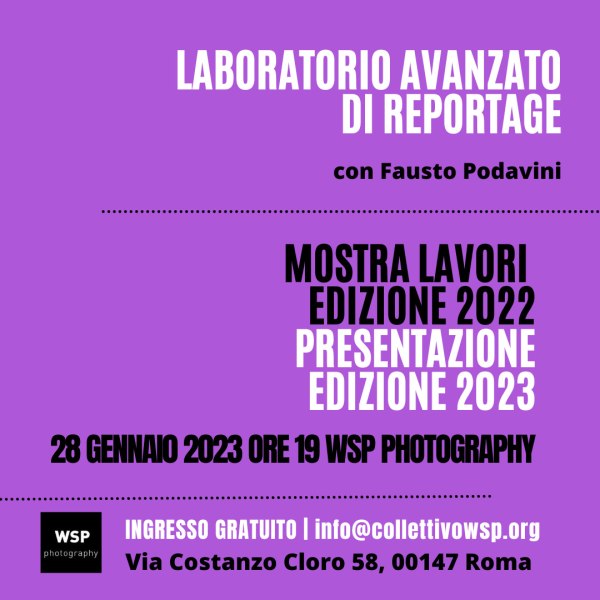 Sabato 28 gennaio alle ore 19:00 si svolgerà una serata dedicata al Laboratorio avanzato di reportage, il nostro percorso di alta formazione nel reportage a cura di Fausto Podavini. Nel corso della serata saranno presentati i progetti realizzati dai partecipanti all’edizione 2022, attraverso l’inaugurazione di una mostra fotografica con una selezione di foto ciascuno e la proiezione dei lavori multimediali.