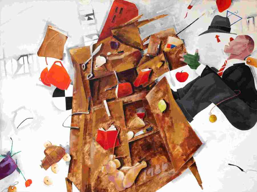 Nella serie Profughi i personaggi di Tadini sono persone che come pacchi si muovono in spazi in assenza di gravità con dei cartellini attaccati addosso. Uomini ed oggetti sono in uno spazio aereo e privo di peso. Non c’è territorio di appartenenza c’è solo il viaggio. Un percorso da fare insieme alle cose, quelle che per Tadini rimangono oltre l’uomo a significare ciò che c’era. Presenze e assenze. Nature morte che parlano di noi e raccontano storie. A volte sono fardelli da cui non riusciamo a separarci e ci sono pesci sugli alberi a ricordarci lo stravolgimento dei luoghi e l’atto estremo di sopravvivenza e di non rinuncia alla vita.