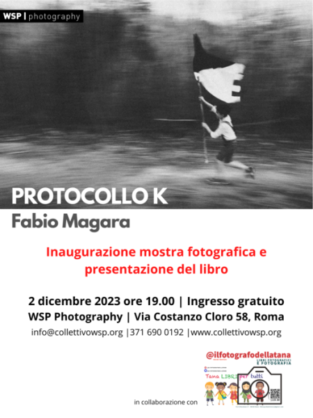WSP Photography in collaborazione con Il fotografo della Tana, è lieta di presentare “Protocollo K” la mostra fotografica di Fabio Magara, che inaugurerà sabato 2 dicembre alle ore 19 presso la nostra sede in Via Costanzo Cloro 58.