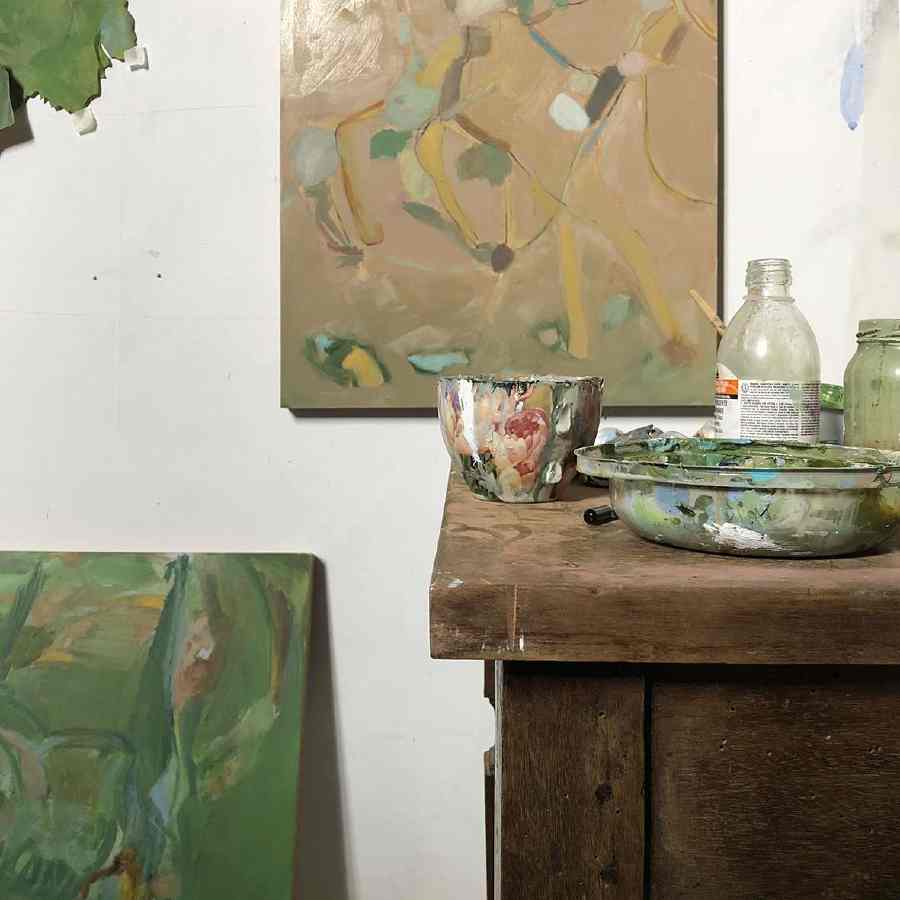 Nell’ottobre del 2018 sono stata invitata a Casa Sponge per una breve residenza curata da Angelo Bellobono e Giovanni Gaggia sul tema del paesaggio.Nella giornata dedicata alla pratica della pittura en plein air avevo scelto di dipingere accanto alla finestra di una casetta verde, forse un ripostiglio per attrezzi, ai margini di Montesecco, un piccolo borgo affacciato su un’ampia valle. La vicinanza della casa e alcuni arbusti racchiudevano la vista a quell’orizzonte aperto che gli altri pittori avevano scelto di ritrarre, lasciando che il mio sguardo non si smarrisse. Durante il lavoro uno dei pochi abitanti del paese portò da bere una bottiglia del suo vino, a quel gruppo variegato di pittori e dopo averci rifocillato ritornò sui suoi passi.