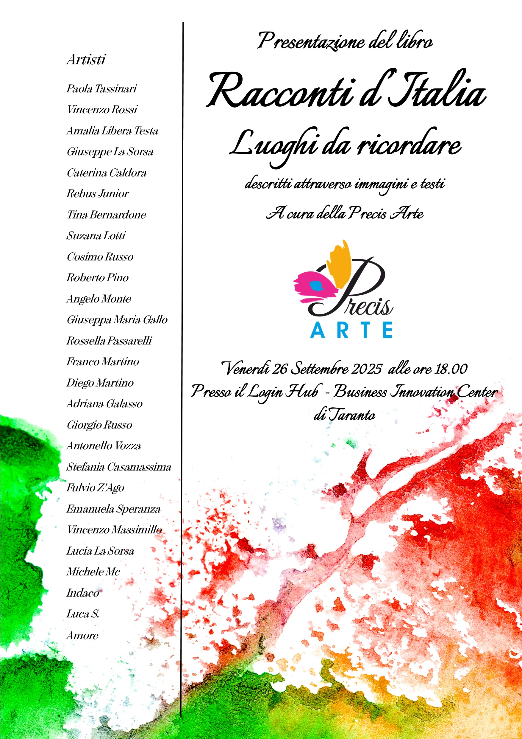Un viaggio tra emozioni, ricordi e immagini che raccontano l’Italia attraverso l’arte: è questo lo spirito del libro del progetto d’Arte RACCONTI D’ITALIA – Luoghi da ricordare, che verrà presentato venerdì 26 settembre alle ore 18.00 presso la sala meeting del Login Hub – Business Center di Taranto.