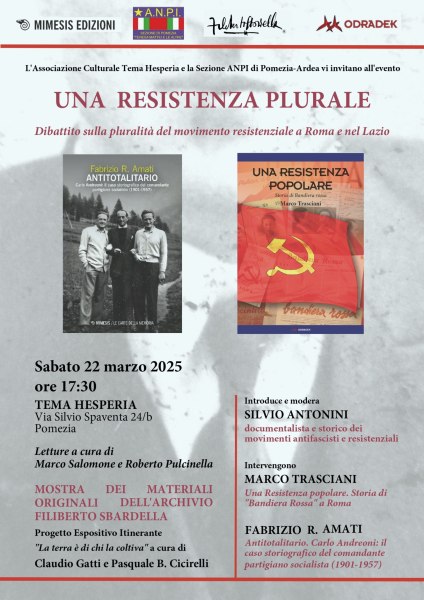"A causa di una ricerca storiografica per la maggior parte legata agli interessi di partito e alle ideologie novecentesche, a più di ottant'anni di distanza dal giorno della liberazione di Roma e del Lazio, la particolare esperienza collettiva che è passata alla storia con il nome di Resistenza conserva ancora numerosi coni d'ombra da illuminare: nell'incontro del 22 marzo Fabrizio R. Amati e Marco Trasciani, con l'ausilio dello storico Silvio Antonini, proveranno a fare luce, attraverso il frutto della loro personale ricerca riguardo alle fonti, sull'azione partigiana di coloro che non riconoscendosi nell'alleanza politica e militare costituita dal Comitato Centrale di Liberazione Nazionale, combatterono la propria battaglia contro il nazifascismo a modo loro: accanto al popolo e a viso aperto, a costo di sacrificare la propria vita. Si trattò di un modo d'intendere la Resistenza che non fu affatto marginale e che in certe zone della città e della regione fu addirittura maggioritario. L’appuntamento è a Pomezia, presso la Galleria Hesperia in via Silvio Spaventa 24/b, sabato 22 marzo alle ore 17.30, con il patrocinio della sezione Anpi Pomezia-Ardea “Teresa Mattei e le Altre”. Arricchiscono l’iniziativa un estratto della mostra dei materiali originali dell’Archivio Filiberto Sbardella e delle letture tratte dalle pubblicazioni degli autori a cura del laboratorio teatrale dell’Ass. Tema Hesperia".