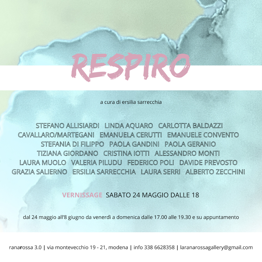 La stagione espositiva della ranarossa 3.0 arte contemporanea prosegue con la terza edizione della collettiva dal titolo RESPIRO a partire da sabato 24 giugno dalle 17.30 in via Montevecchio 19-21, centro storico Modena