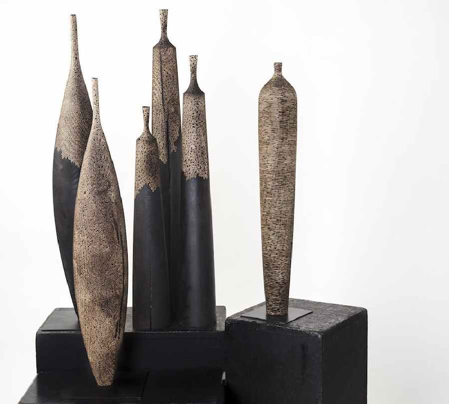 La materialità cromatica che egli determina nei suoi lavori diventa un modo per raccontare, a chi guarda i suoi lavori, il continuo intrecciarsi esistenziale di tecnica e sentimento. Nella serie di FORME e VOLUMI i neri, ottenuti con lo stress termico della bruciatura, sfidando la resistenza della materia, rapiscono la luce, la inghiottono nel profondo del carbone, non le permettono di riflettersi ma solo di delineare il confine tra l'opera e il circostante. I bianchi, ottenuti sbiancando il legno con l'acido, confondono quel confine, lo rendono labile in un'apparire di luce che, sia quando compare in piccoli filamenti o piccole sfere nel buio del carbone sia quando espande il volume dell'opera nella sua interezza, spiazza lo sguardo. Il rovello a cui è sottoposta la luce nei CORALLI lavora su una vera e propria metamorfosi, trasformare cioè l'immagine di una splendida concrezione naturale in una forma che in ogni suo anfratto, in ogni piega, in ogni alveolo, in ogni minuscola curvatura, racchiuda, mutata dal rapporto incessante luce ombra, non più la semplice naturalità di una resistenza e di un accrescimento, ma il farsi visibilità dell'esperienza dell’autore. [...]” (dal testo critico di Michela Becchis)