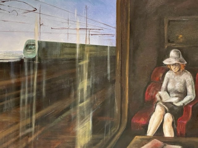 L'atmosfera è sospesa tra realtà e sogno grazie al gioco delle prospettive e dei riflessi, dai finestrini del treno da cui si scorgonoi paesaggi imbiancati dove sfrecciano treni all'orizzonte e paesaggi industriali, al treno regionale in sosta da cui si scorge un treno fermo nella stazione. Tele che esprimono solitudine, malinconia ma anche paesaggi inediti dai colori rasserenanti, con i campi dalle tinte pastello e il cielo di un azzurro 'angiolesco'. L'attenzione si focalizza sul viaggio interiore in particolare nelle tele dedicata al tema delle letture in viaggio, dal libro ritratto aperto poggiato sul tavolino del treno al ritratto di una signora assorta nella lettura, con il paesaggio fuori dal finestrino a fare da segnografia per il lettore e lo spettatore. Scene che si ispirano a 'Castelli di rabbia' di Baricco quando scrive "Sui treni, per salvarsi, per fermare la perversa rotazione dei quel mondo che li martellava di là dal vetro , e per schivare la paura , e per non farsi rsucchiare dalla vertigine della velocità che certo doveva continuamente bussargli nel cervello quanto meno nella forma di quel mondo he strisciava di là dal vetro in forme mai viste prima, meravigliose certo....Sui treni, per salvarsi, leggevano".
