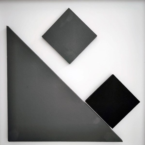 Stefano Paulon instead explains his narrative through the material. He mainly uses wood and cardboard on whose surfaces he then intervenes with acrylic-based cement finishes which he uses to give life to geometric shapes usually proposed in installation mode or, as on this occasion, inserted within the limits of paintings/containers that become a view onto his artistic world.