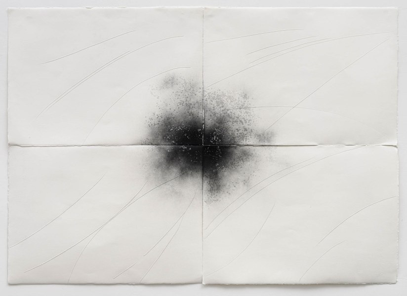 La prima sezione presenta una serie di disegni su carta Amatruda 70x50, con graffiature e forme geometriche in acrilico. La seconda ospita un'installazione, sulle pareti della galleria, composta da assi orizzontali di legno e un monolite, dipinti entrambi di nero.