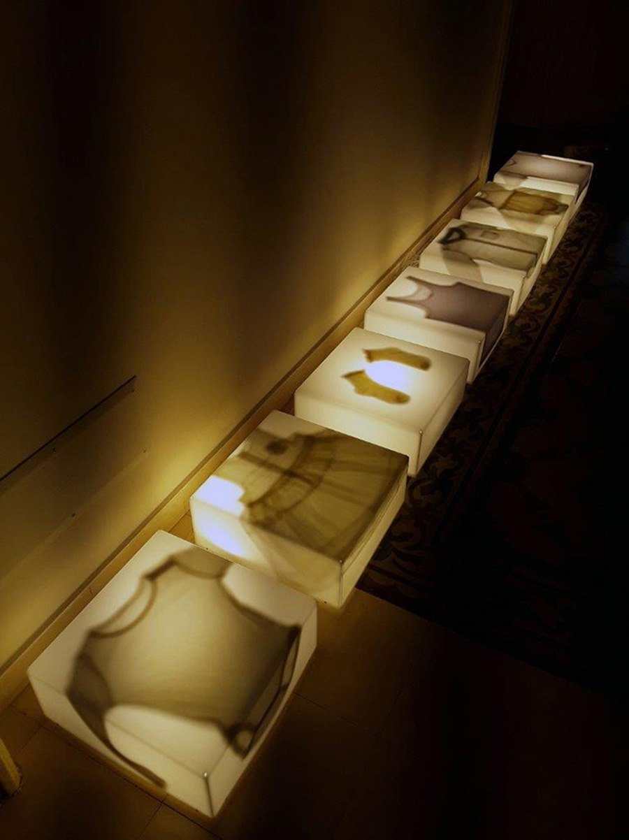 Attraverso l’affiorare di parvenze spettrali (Indizi) o siderali (Reliquie astrali), l’artista racchiude in teche luminose entità impalpabili e fluide sottratte allo scorrere del tempo, quasi raggelate in una dimensione di eterna sospensione. Piccoli frammenti di vita assunti a simulacri di un’umanità che tende a sbiadire, fino a perdersi nei meandri del tempo, salvo poi riapparire privata di essenza e cronologia. Forme incongrue che si trovano a vivere in un mondo forzato ed enigmatico; visioni ben oltre l’esperienza sensoriale, “in cui lo spettatore ritrova la dimensione dell’isolamento e può sentire il silenzio del mondo” avrebbe detto Magritte.