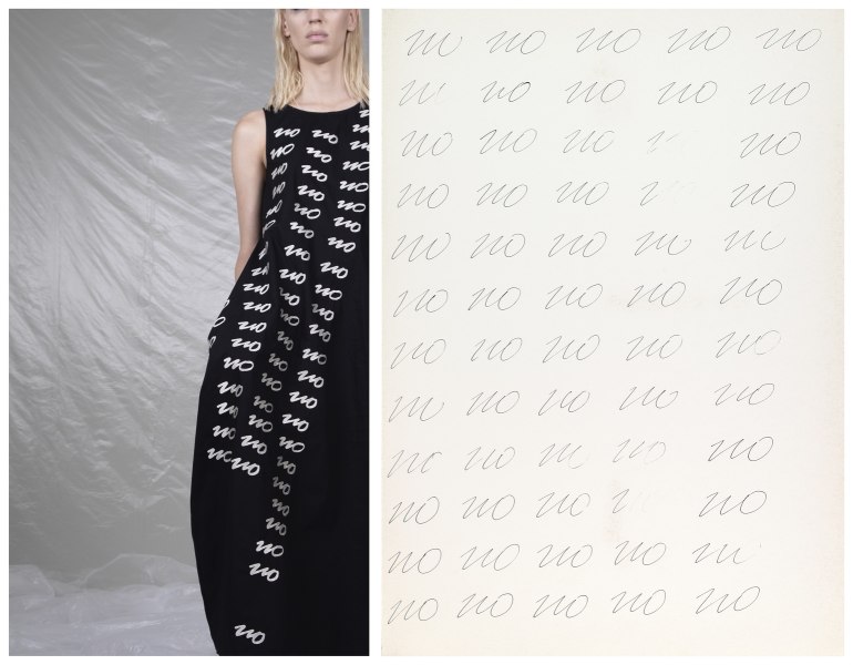 I celebri NO di Scaccabarozzi si manifestano risoluti ed inaspettati su un abito attraverso la lentezza del ricamo, come per evidenziare il tempo necessario alla negazione che si ripete e si moltiplica, tramutandosi in segno grafico che si rinforza e si annulla allo stesso tempo. Tessuti leggeri, stropicciati, lavati, dipinti a mano, tagliati a laser e ricuciti con certosina perizia a creare una cascata di petali quadrati. Il gioco dei contrasti morbido-rigido, trasparente-opaco, croccante-fluido, maschile-femminile è sempre presente. Le maxi t-shirt in tulle, seta e batista di cotone invitano alla sovrapposizione, giocando con trasparenze, materiali e colori. Il full moon dress di jersey aderente ripropone la forma del cerchio, questa volta intagliato nel tessuto, e può essere giocato da solo o in sovrapposizione. Una gonna interpreta le Iniezioni, opere degli anni Ottanta, con stampa fatta a mano di bolli che, appuntati alla gonna come petali, seguono il movimento della persona svelando altre iniezioni colorate, piccoli spiragli, porte sull’anima inafferrabile e multicolore. L’omaggio a Scaccabarozzi ritorna, infine, nell’abito pensato come un collage di carta da giornale su una mussola di cotone, creando un effetto spiazzante e confermando la continua ricerca sui materiali, che divengono plastici e concettuali. L’illusione della materia continua anche su alcuni gioielli, la cui preziosità si fonda sulla ricerca formale e sul processo produttivo.